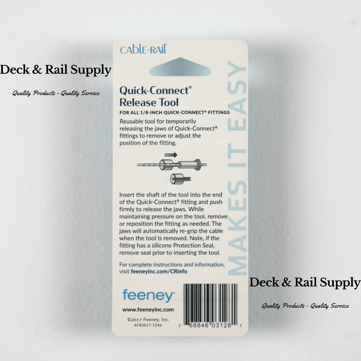 Cable Release Tool by Feeney removes 1/8" Cable from any Feeney Quick-Connect Fittings. Release Tool slides between the cable and the jaws of the QC fitting to easily adjust or remove the cable.