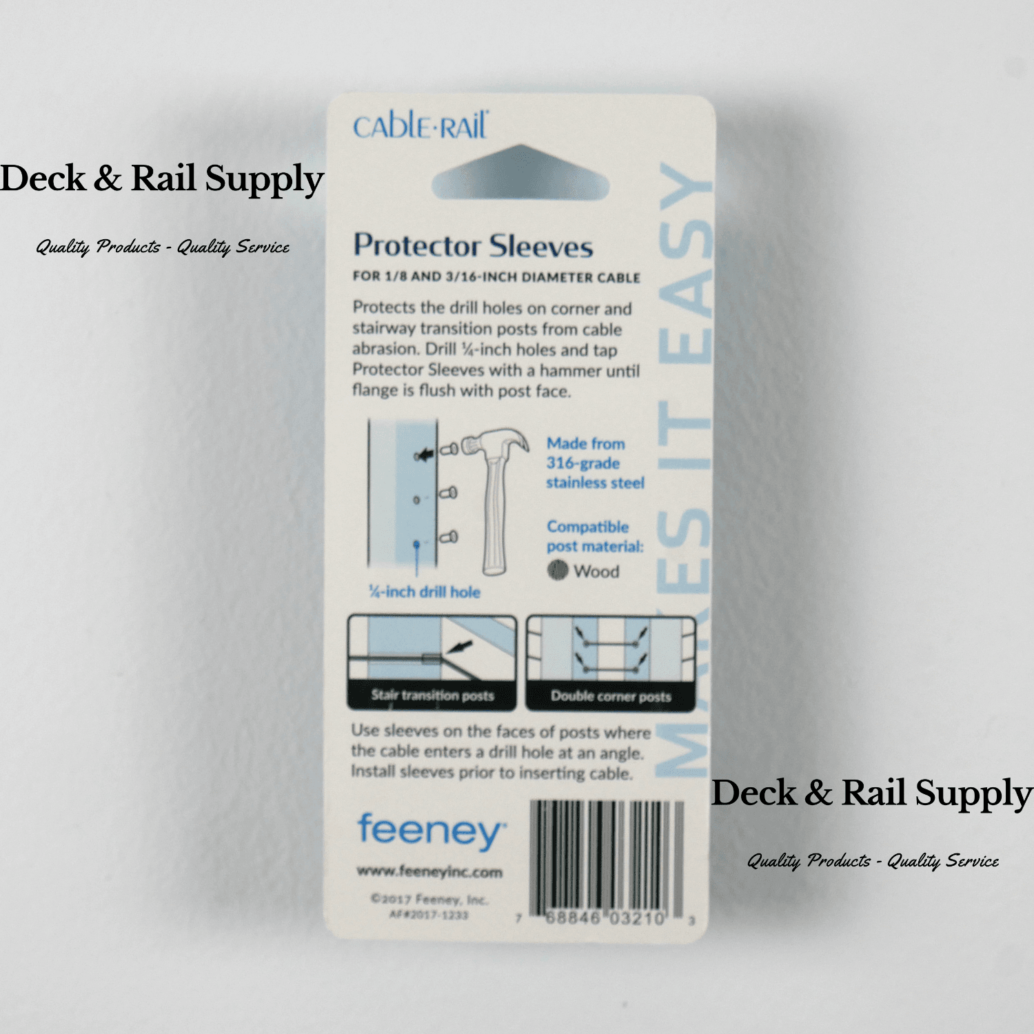 Stainless Steel Protector Sleeves keep 1/8" Cable from "rubbing" or "wearing" on the post where a turn in the cable appears. Protector Sleeves require a 1/4" drilled hole to fit in and accept 1/8" Cable. Use with wood 4x4 or 6x6 posts when transitioning cable railing down a set of stairs, or making a level angle turn. Protector sleeves are sold 10 per bag.