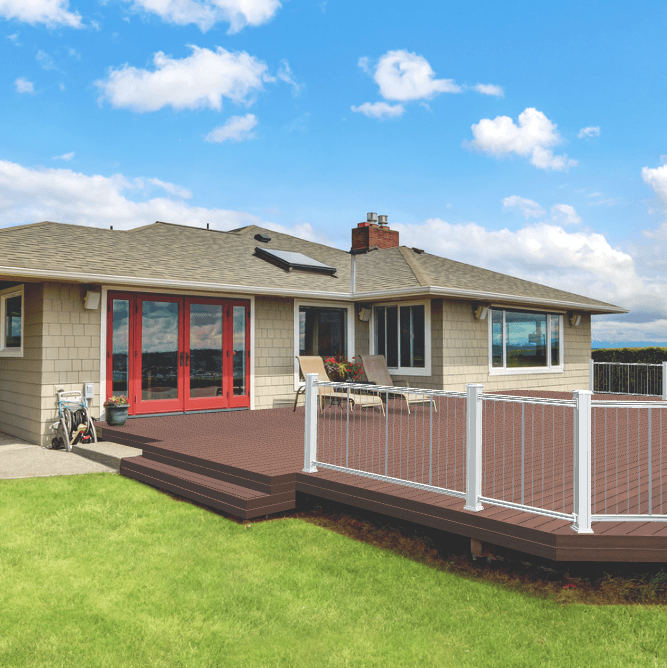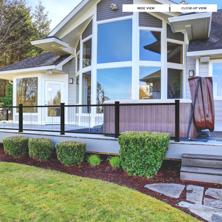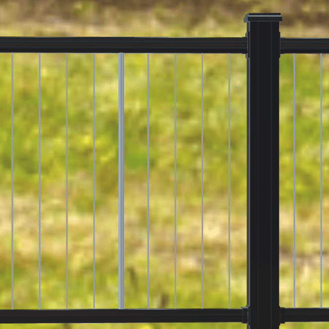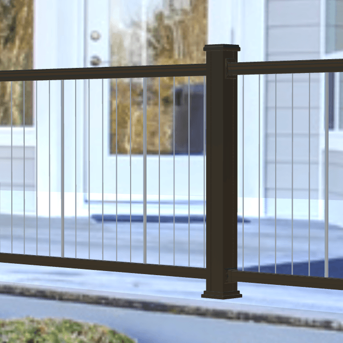 American Vertical Kits can be purchased in three textured profile colors: Black, Bronze, and White. Lengths of American Vertical Rail Kits available are 6-foot level, 8-foot level, 6-foot stair, and 8-foot stair.