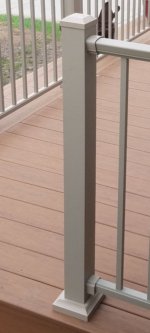 DekPro 3” and 4” Post Kits w/welded flange, cap and flair, are the first step in establishing DekPro aluminum railing. 3 inch x 3 inch posts and 4 inch x 4 inch posts attach to the surface of any Composite Deck, PVC Deck surface, or Concrete. Posts are required every 8' or less using the DekPro system. Existing posts can be used in conjunction with 4” or 3” DekPro Post Kits.