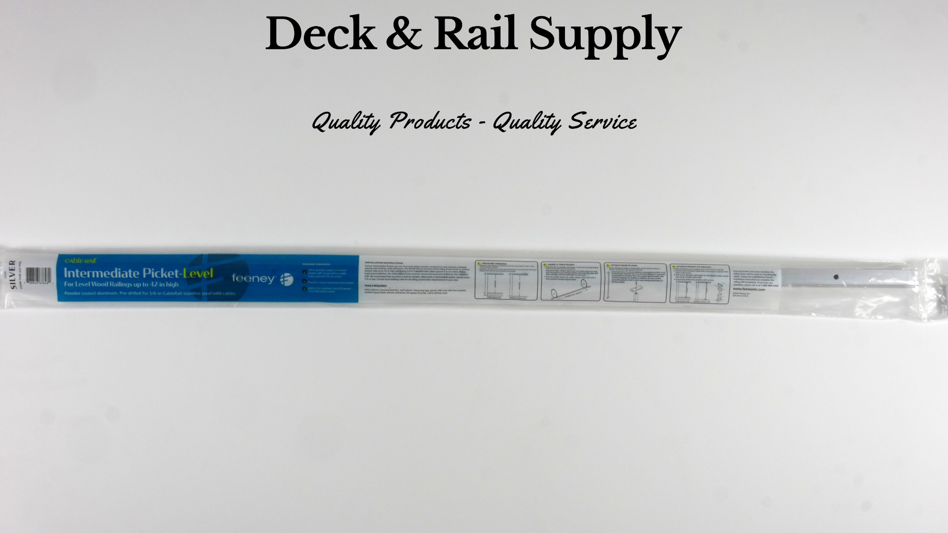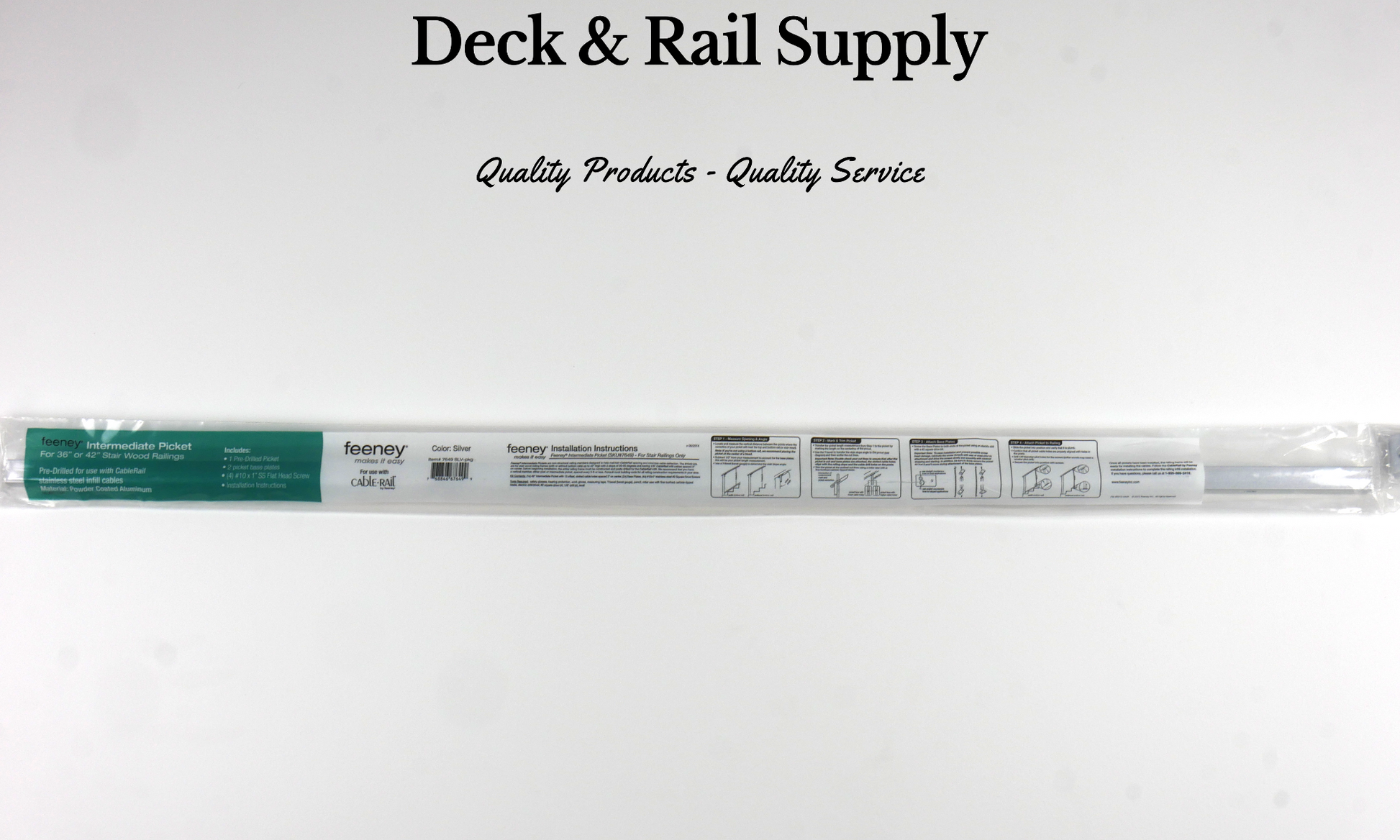 Intermediate Pickets by Feeney retain adequate spacing for 1/8" Horizontal Cable, Wire, and CableRail Kits. Pickets should be positioned between posts, attaching to the underside of the top rail, and the top side of the deck or bottom rail. Intermediate pickets include two brackets and for easy installation, and screws for wood or composite handrails. Available for Level or Stair application, Feeney Intermediate Pickets space cables at 3" on center, and allow for 1/8" Cable or Wire.