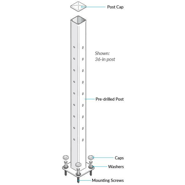 DesignRail Kit (IN) Level Intermediate Post Kits by Feeney are used between Quick Connect and Threaded Terminal post where the cable passes through in a straight line. Designed for 1/8" cable only, and available in for 36" Railing or Commercial 42" Railing. 36" Post Requires 9 Cable Runs, 42" Post Requires 11 Cable Runs.