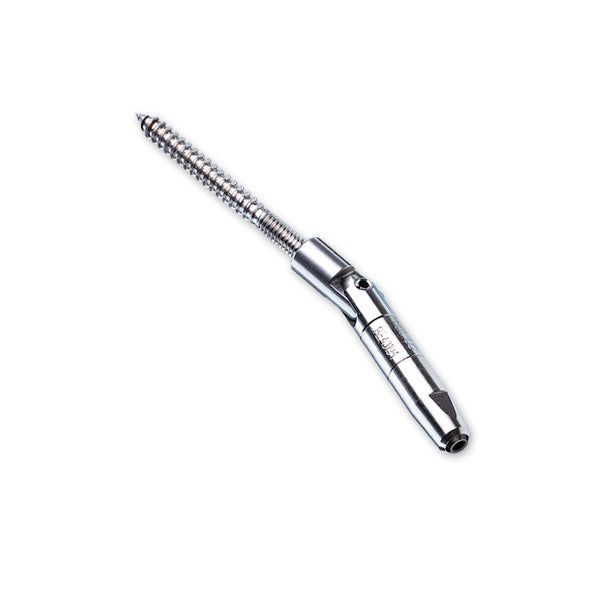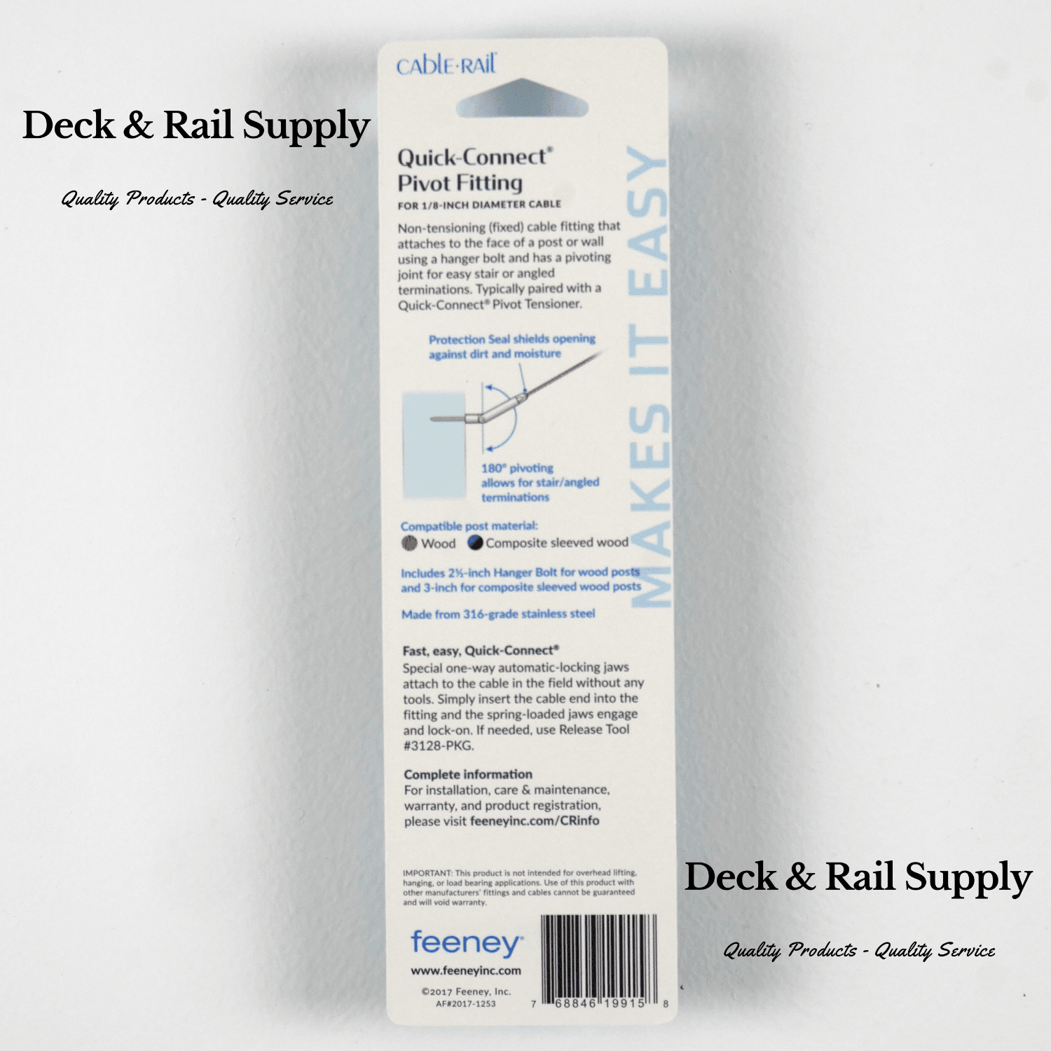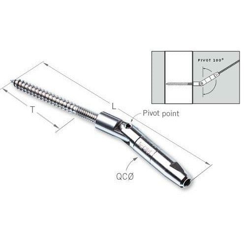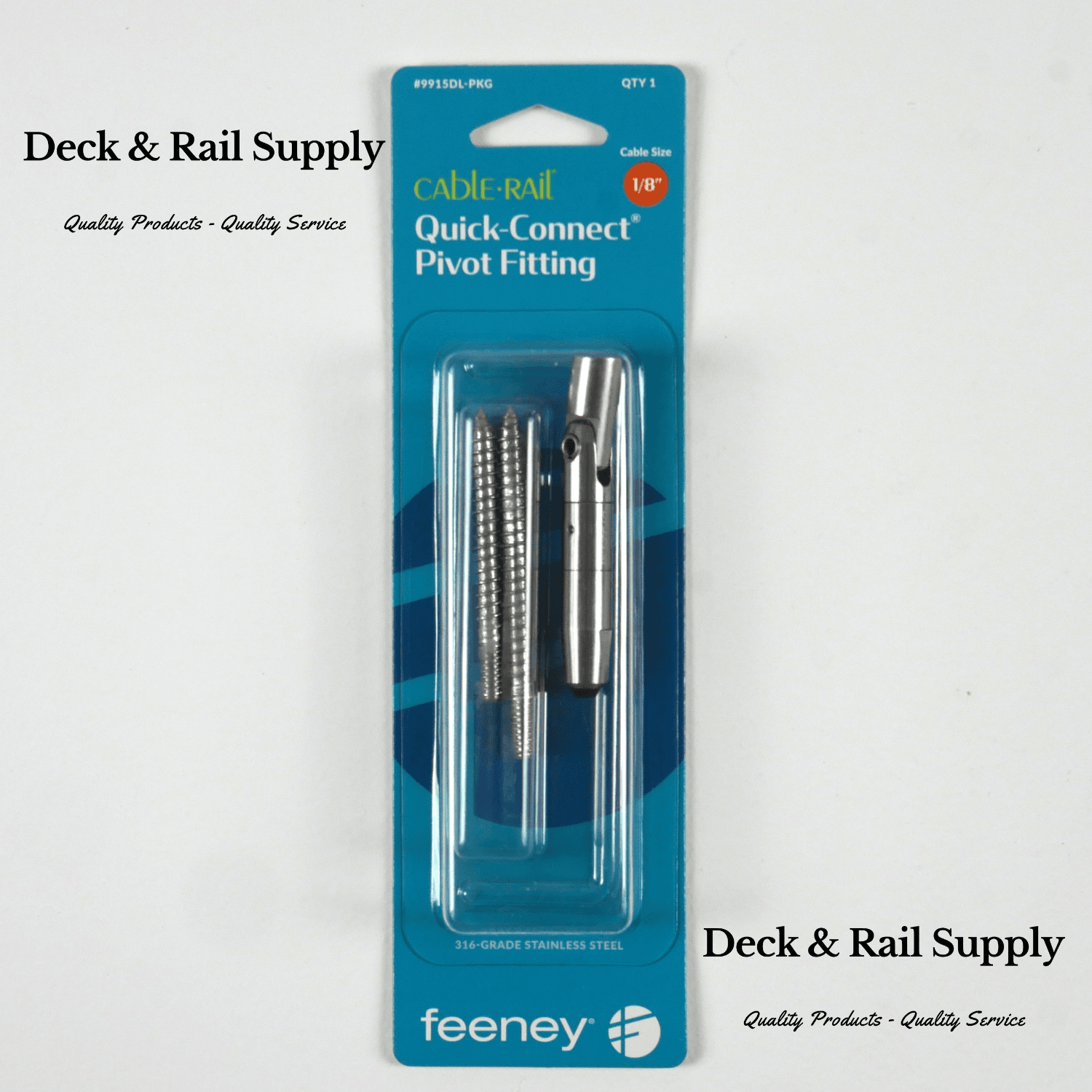 Quick Connect Pivot #9915 is a 1/8" Compatible fixed end connector, using a lag for stair rail application. The Pivot Quick-Connect, with a wide 180 degree pivoting range, screws into the post and allows the cable to adjust to the needed angle. Each cable pair must include one tensioning fitting, the 9916 Pivot Tensioner can be paired with this fitting.