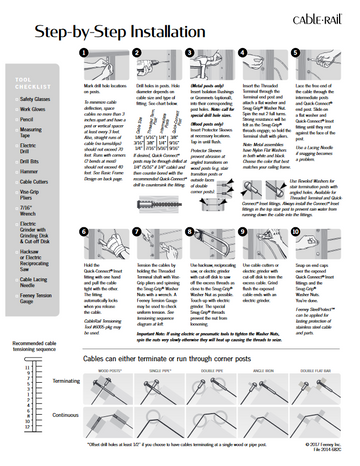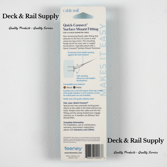 Quick Connect Surface Mount #9903 is a non-tensioning fixed-end Cable Receiver that attaches to the face of a wood or metal post (metal screws not included) used for 1/8" Cable and paired with Tensioning Surface Mount 9913. Each run of the cable must include one tensioning fitting Includes 2 screws for mount installation.