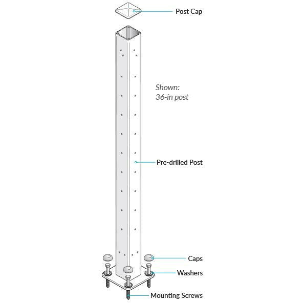 DesignRail Kit (SC) Single Corner Level Post Kits by Feeney allow for only one post on level cable turns up to 90 degrees. DesignRail Single Corner Level Posts are pre-drilled and used with 1/8" Cable for a continuous run at any level corner. Must use with Level Rail Kits on either side, as well as QC and TT posts in the cable section. 36" Post Requires 9 Cable Runs, 42" Post Requires 11 Cable Runs.